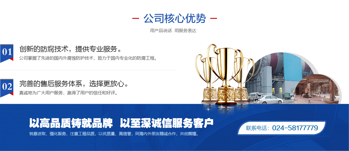2004;GB/T28001-2011/OHSAS18001:2007;GB/T19001-2008/ISO9001:2008認(rèn)證 體系,取得了化工防腐蝕施工資質(zhì)等級(jí)一級(jí)單位,遼寧省腐蝕與防護(hù)學(xué)會(huì)防腐施工專(zhuān)業(yè)委員 會(huì)主任委員會(huì)主任委員單位,是中國(guó)石油撫順石油化工公司網(wǎng)內(nèi)成員單位。幾年來(lái)本著“客 戶為尊、精益求精”的服務(wù)宗旨,服務(wù)于基礎(chǔ)設(shè)施、石油、化工、治金、化纖、能源、礦山、 核電站、海洋工程等眾多行業(yè)企業(yè)。 ![]() ![]() ![]() ![]() |